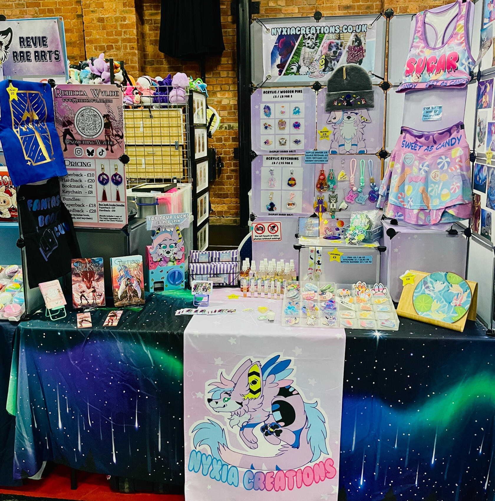 Nyxia Creations is a UK based artist and author, creating a wide variety of artwork, accessories, clothing, and other merch. Everything we create is hand drawn / hand made! We predominantly create products inspired by the furry fandom, including fursuits, though most of our products available at conventions are unique designs.Also included in my stock at every event, is my fantasy book series, The Lion's Apprentice: A trilogy about found family, trauma, and platonic love.We attend a wide variety of events throughout the year (event timetable is listed below). You can check out a variety of our available products below, and check out our online store for more not shown here. More info about my books and fursuit work are also linked below!